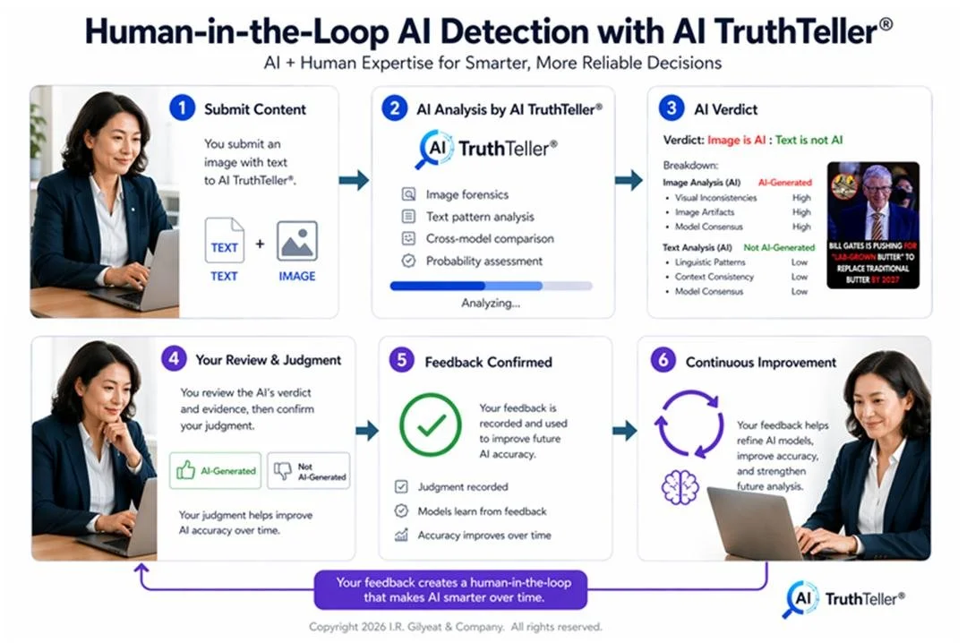 When we decided to make AI detection software we committed to use human-in-the-loop processes in AI TruthTeller®. This meant we wanted a human somewhere in the middle of the process for all judgments rendered. Artificial intelligence is great, but human judgment, when combined with sophisticated AI tools is superior to an AI only approach. In our world, humans remain responsible for judgment, risk and accountability. We want to help you make better decisions.